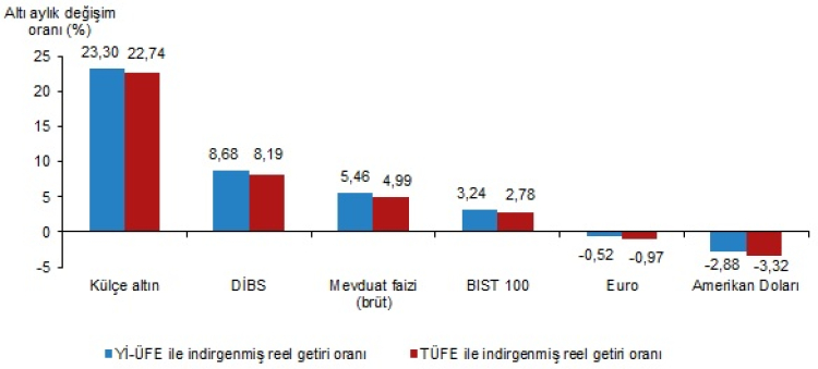 TÜFE ile indirgendiğinde ise DİBS yüzde 1,86, BİST 100 yüzde 0,47, dolar yüzde 0,23 reel getiri sağladı; külçe altın yüzde 0,44, Euro ise yüzde 0,48 kaybettirdi.