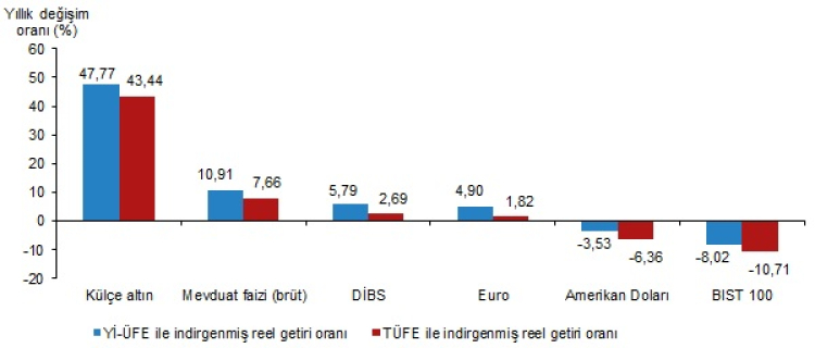 TÜİK’in yıllık değerlendirmesine göre külçe altın, yatırımcısına; Yİ-ÜFE ile yüzde 47,77, TÜFE ile yüzde 43,44 reel getiri sağlayarak tüm yatırım araçlarını geride bıraktı.