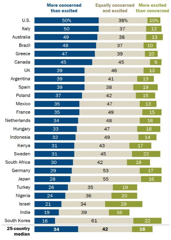 Korku seviyeleri ülkelere göre değişiyor. ABD ve İtalya’da katılımcıların yarısı endişeli olduklarını söylüyor. ABD’de sadece %10’luk bir kesim heyecanlı. Kanada ise ABD’den daha az heyecan duyan tek ülke (%9).